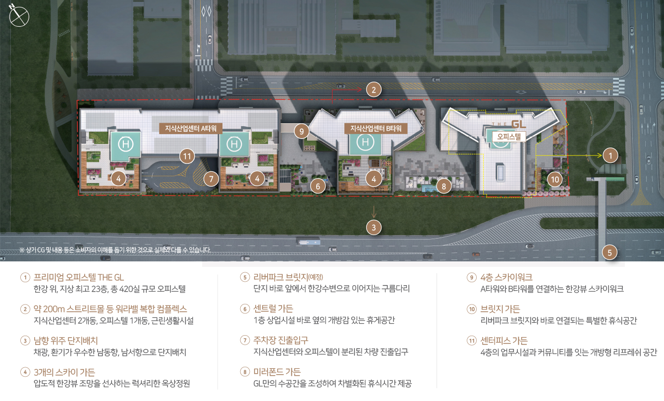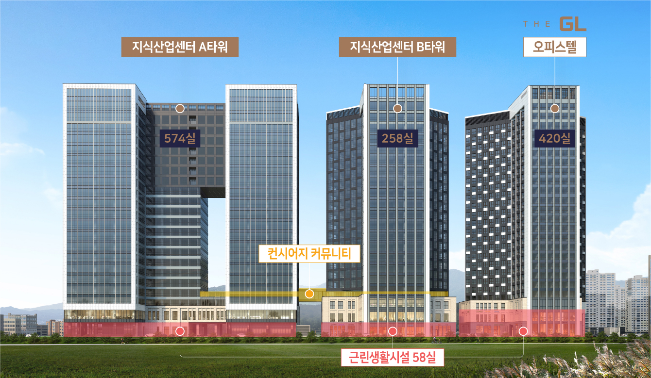 자유로를 지나 첫 관문으로 만나게 되는 ‘GL메트로시티 한강’은 한강을 내려다볼 수 있는 4층을 과감하게 로비층으로 설계, 입주자 모두가 한강을 누리는 피트니스센터나 회의실, 어메니티 공간 등 특화된 커뮤니티를 공유하고, 4층 이상의 공간은 비즈니스를 위한 프라이버시를 확보할 수 있는 특권까지 갖췄다.